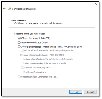 6. Select the “Base-64 encoded X.509 (.CER)” format and click the Next button.