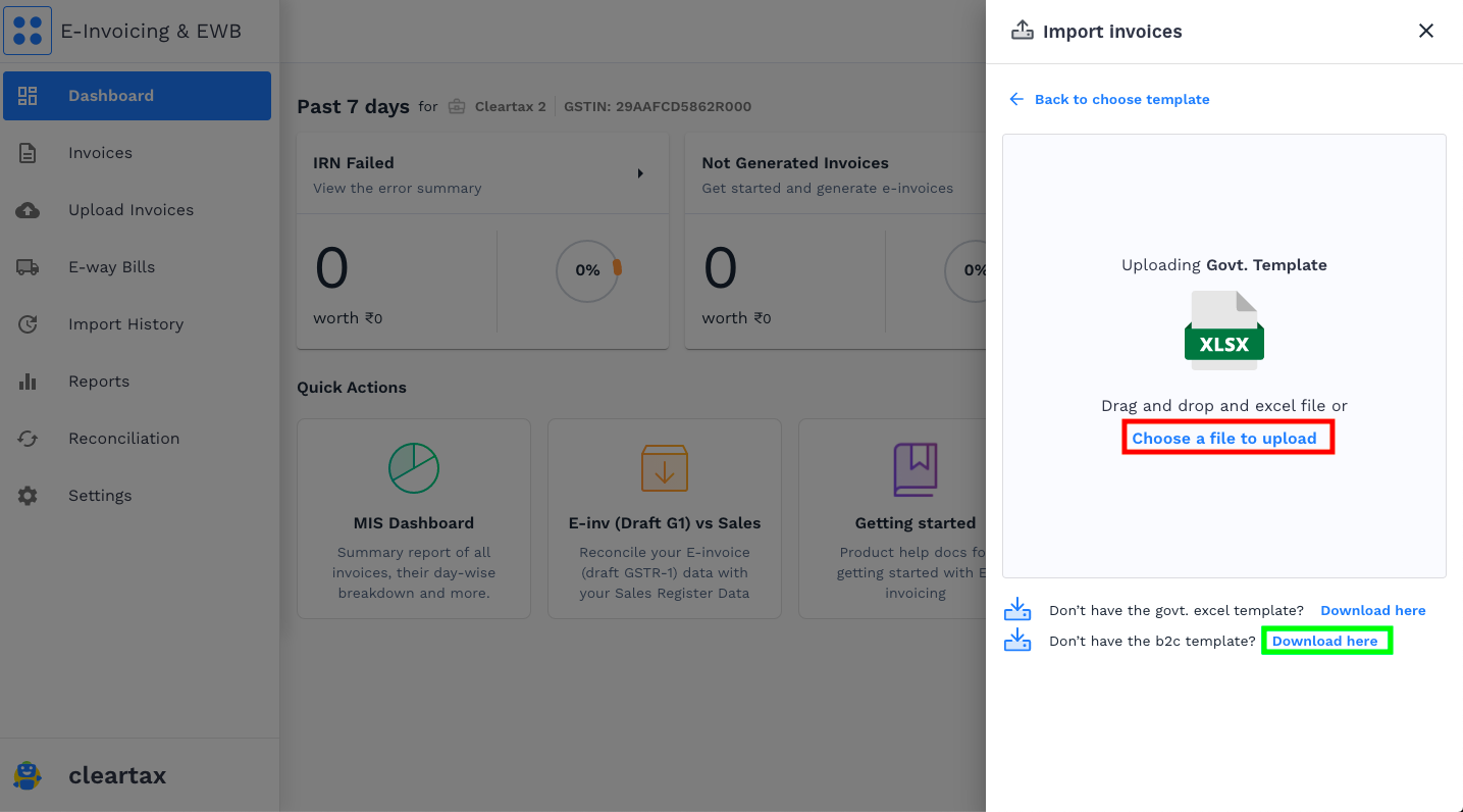 If you have the Govt Excel Template already, fill in the invoice data and select "choose a file to upload". If you don't have the template then download it by clicking the "Download here" option as shown in the image below.