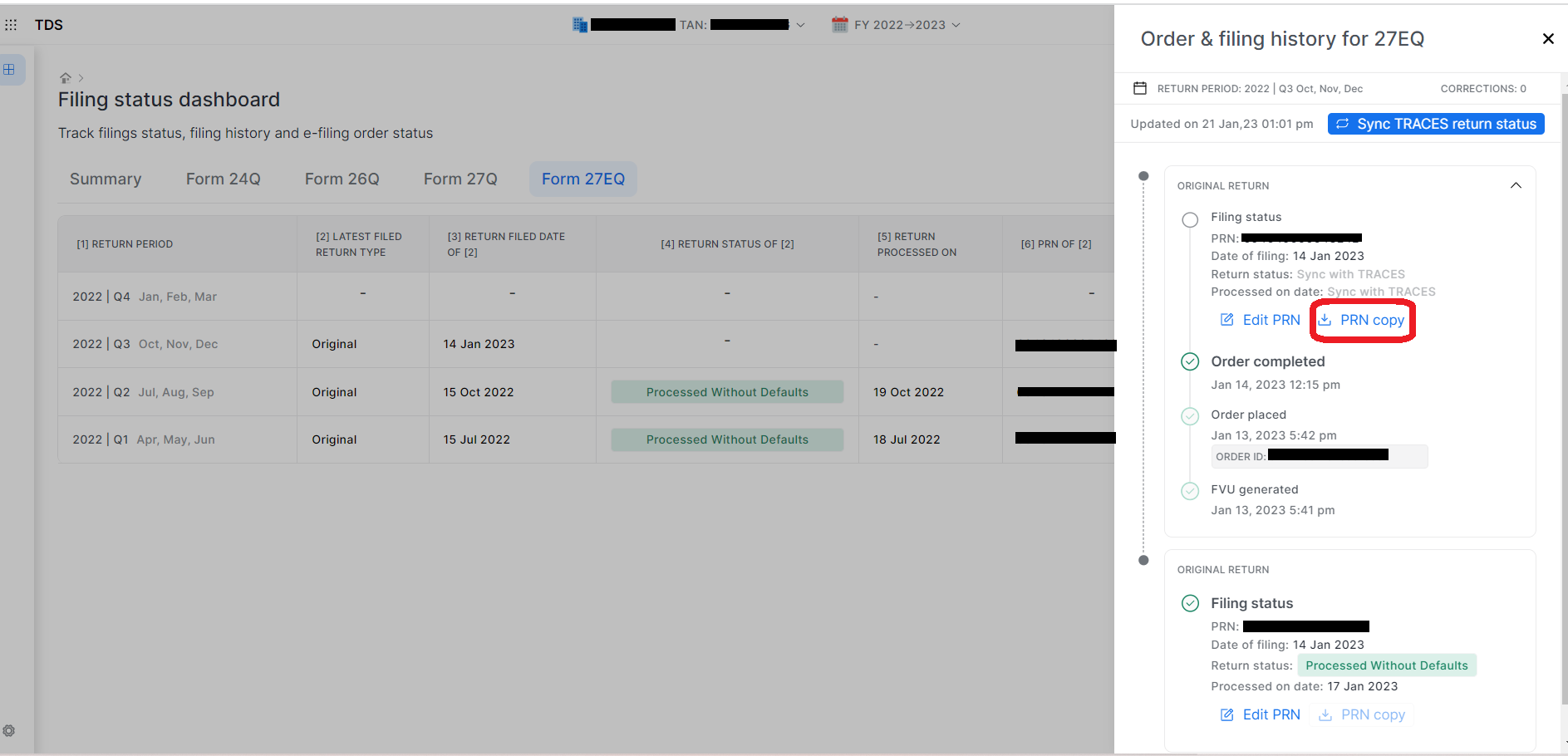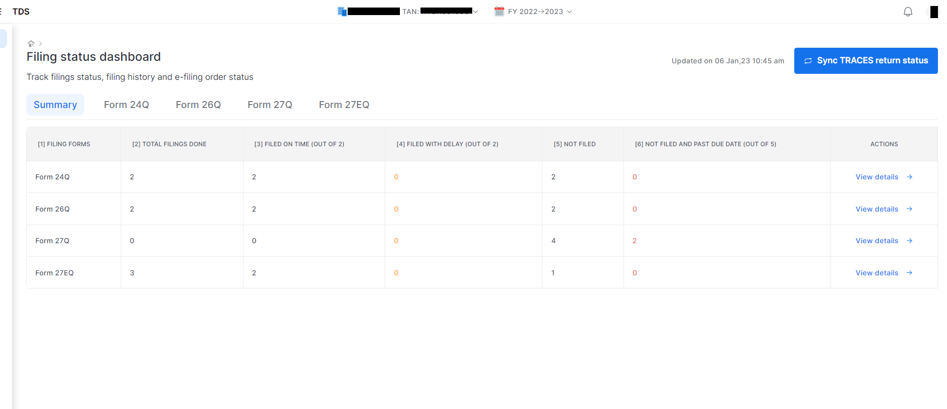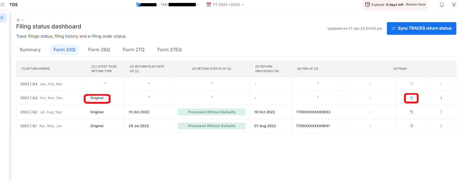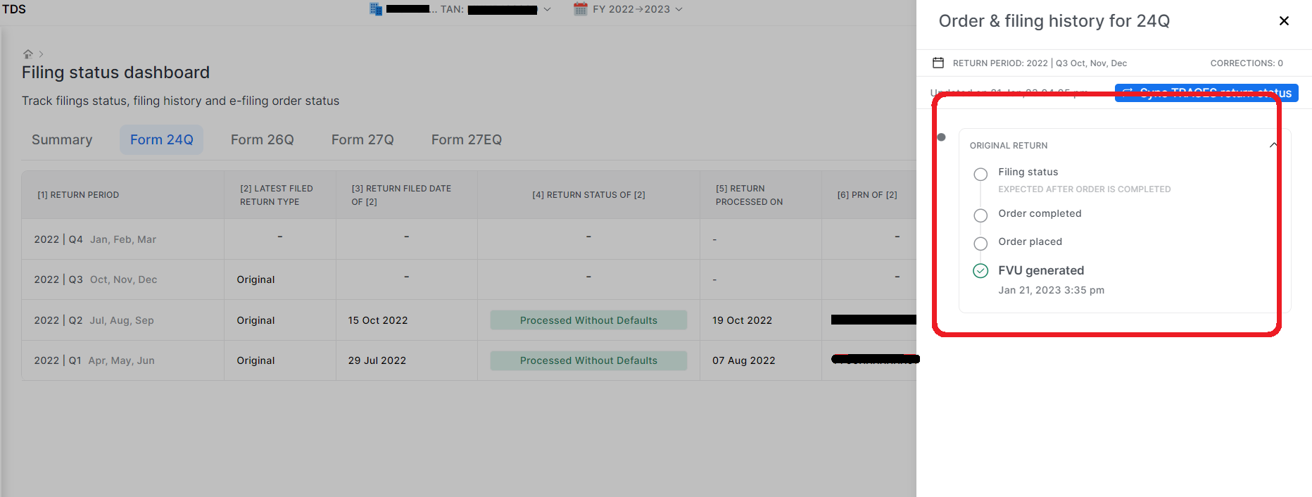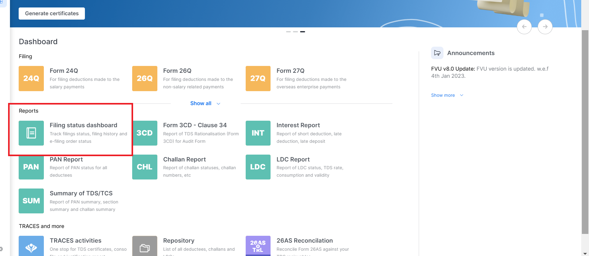 ## **Step: 2 Then you can click on “Filing status Dashboard”.** Choose Deductor and Return period, A Dashboard will open from there You will choose for which form and quarter you want to download the receipt.&#x20;